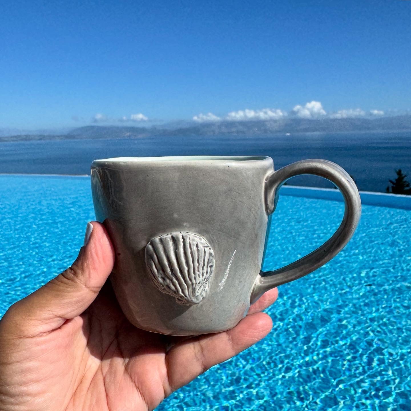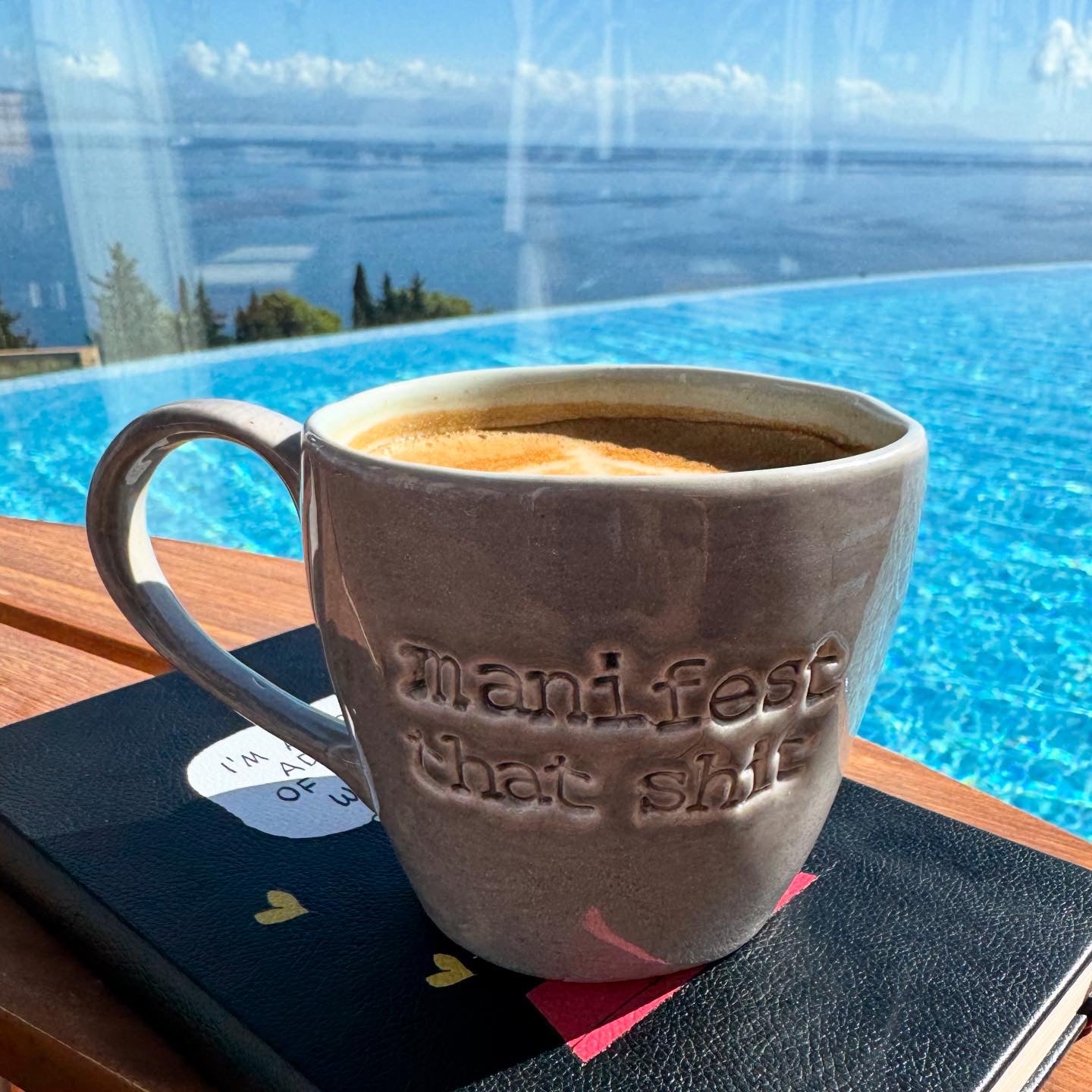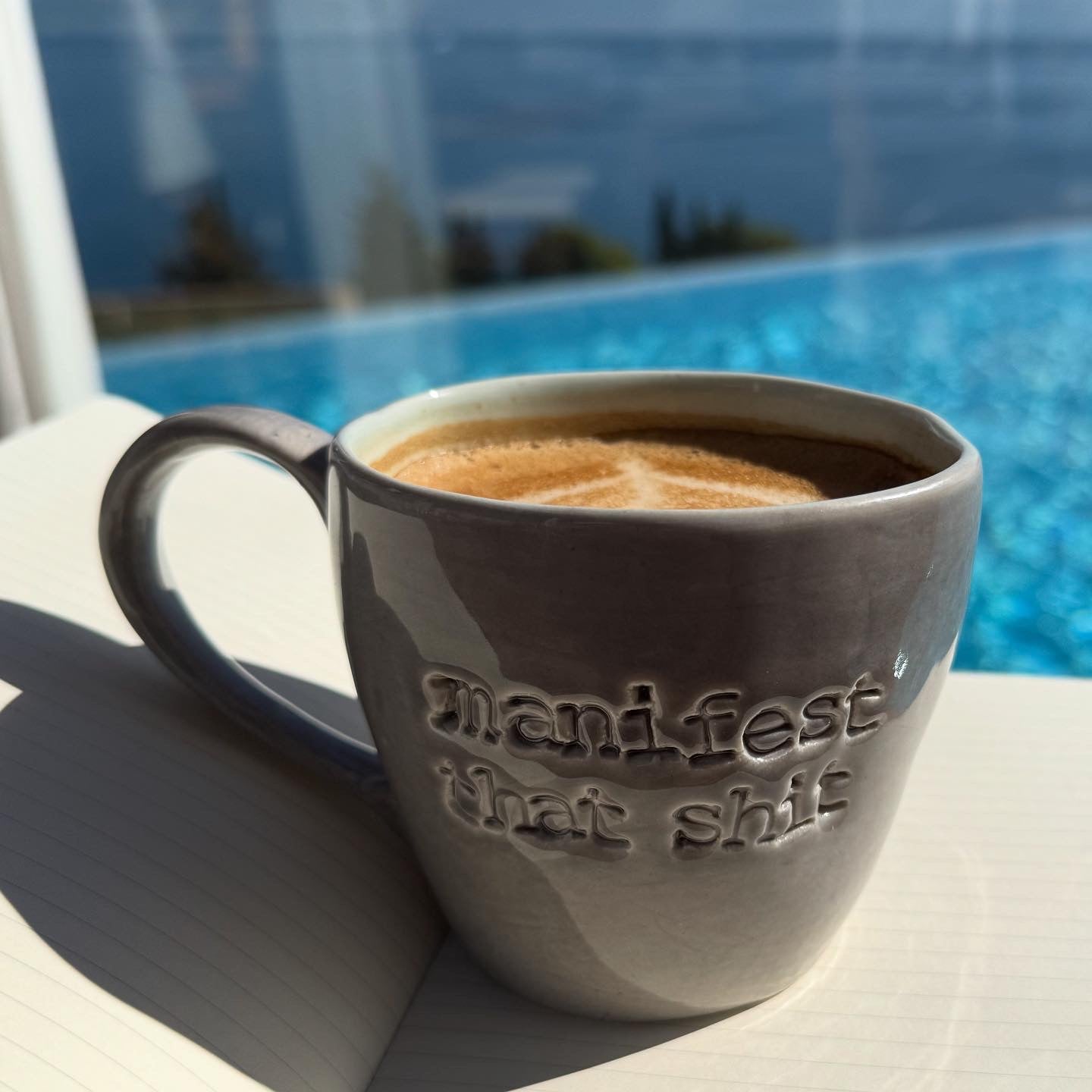 Manifest that shit, wobbly mug large in light aqua and grey. Mug capacity 350ml.
